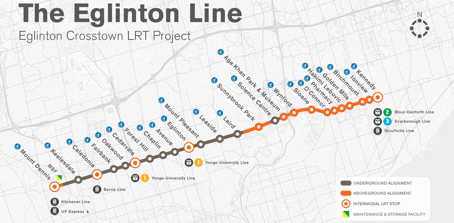 The Eglinton Crosstown Light Rail Transit (ECLRT) is one of Canada’s largest transit expansions—a $6.6 billion investment spanning 19 kilometres across Toronto with 25 stations and stops, including a combination of underground and surface-level facilities known as mixed-grade stations. Running east–west along Eglinton Avenue, the line is expected to improve midtown travel times by up to 60%. Delivered through a public-private partnership by Crosslinx Transit Solutions (CTS) on behalf of Metrolinx and Infrastructure Ontario, the project involves over 2,400 workers and complex multi-agency coordination.
